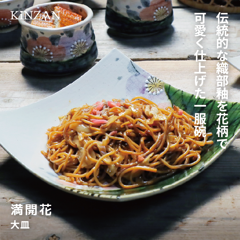 伝統的な織部釉を花柄で可愛く仕上げた大皿。瀬戸焼の中でも大人気織部焼のお皿です。大皿に最適