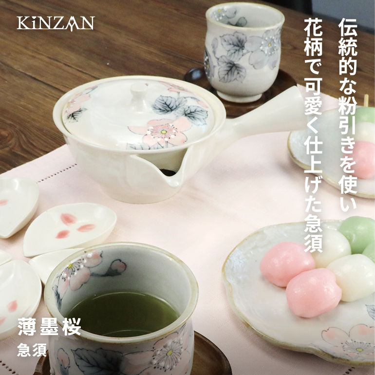 瀬戸焼で粉引きを使った桜柄のシリーズ。シーンを問わず使えます。