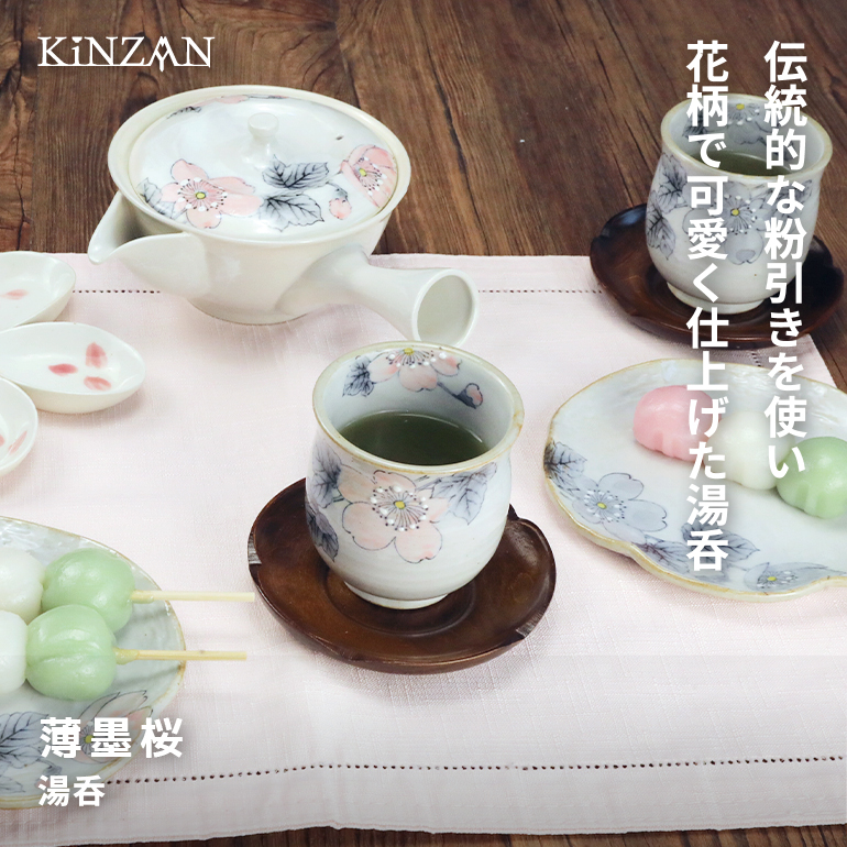 瀬戸焼で粉引きを使った桜柄のシリーズ。シーンを問わず使えます。