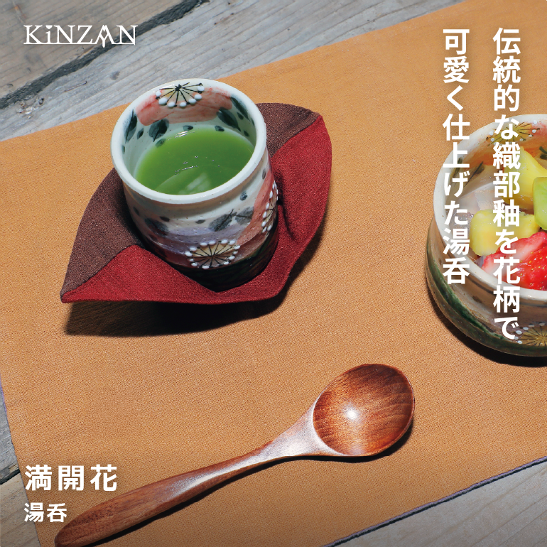 伝統的な織部釉を花柄で可愛く仕上げた湯呑。瀬戸焼の中でも大人気織部焼の湯呑です。