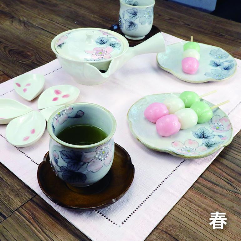 瀬戸焼で粉引きを使った桜柄のシリーズ。シーンを問わず使えます。
